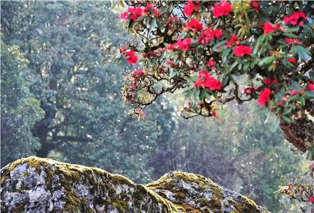 每年陽春三月,山野杜鵑如火如茶。夏秋陰云凝聚時山間白霧翻騰,山峰如云海仙島。宿雨初晴,碧空如洗,山色蒼翠欲滴,山腰白云如天然玉帶。夕陽西下,余光返照,層林生輝。山中金竹林大疊水從懸崖峭壁飛流而下,形成高30米寬3米多的巨大水簾,身臨其境使人驚心動魄。