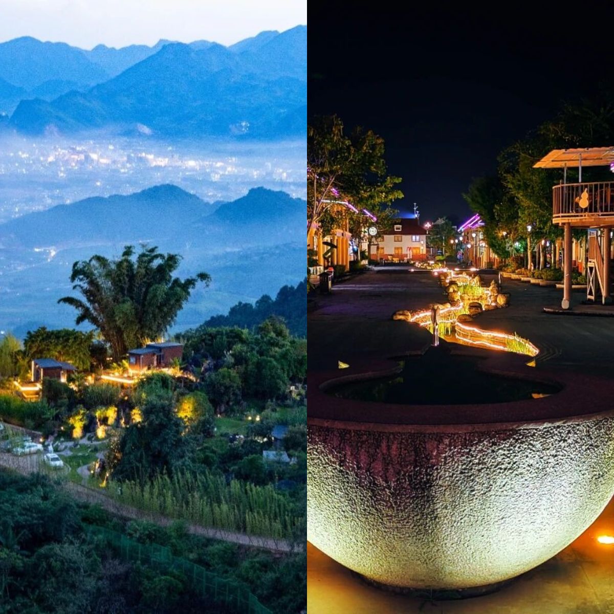 滄源葫蘆小鎮內紅色弧形屋頂特色民居與文化墻、噴水葫蘆、打歌廣場、寨心磚、葫蘆塔、佤王府等佤族特色建筑巧妙地融合在一起,依山傍水、景色秀美,盡顯一幅“阿佤人民唱新歌”的美麗畫卷。在這里,可以品佤族美食、聽月下情歌、縱情篝火狂歡、入住部落民宿。