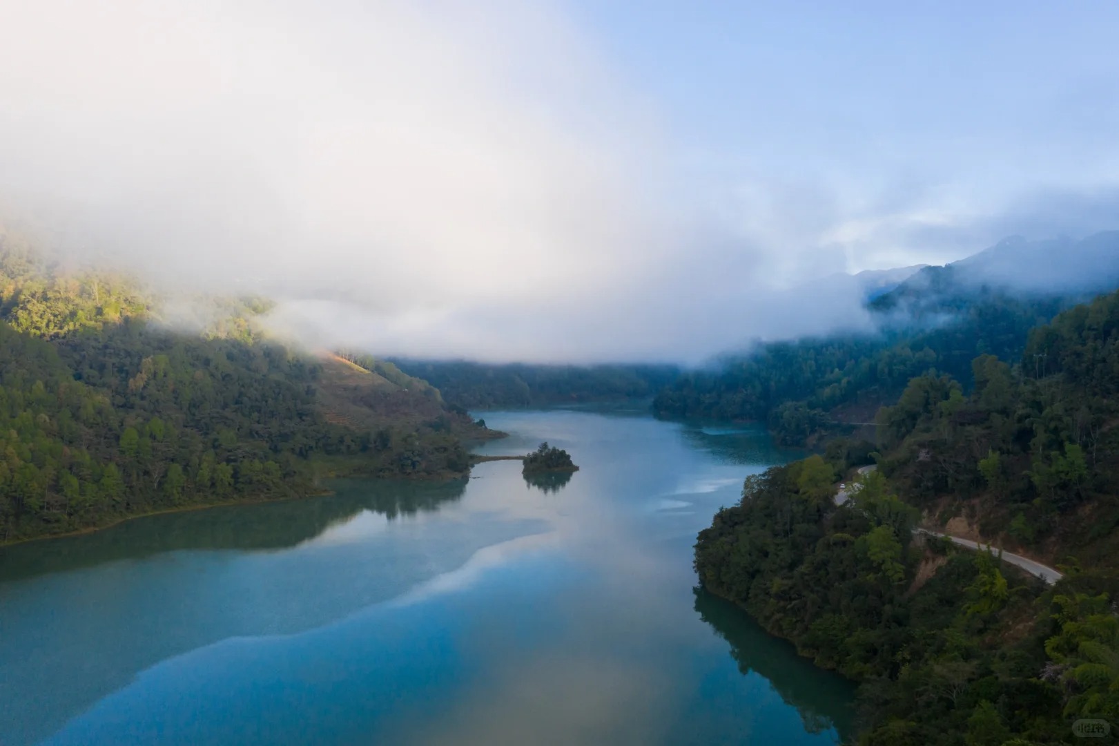 周圍群山連綿,在澄澈藍天的映襯下,展現出一派寧靜悠遠的景象。